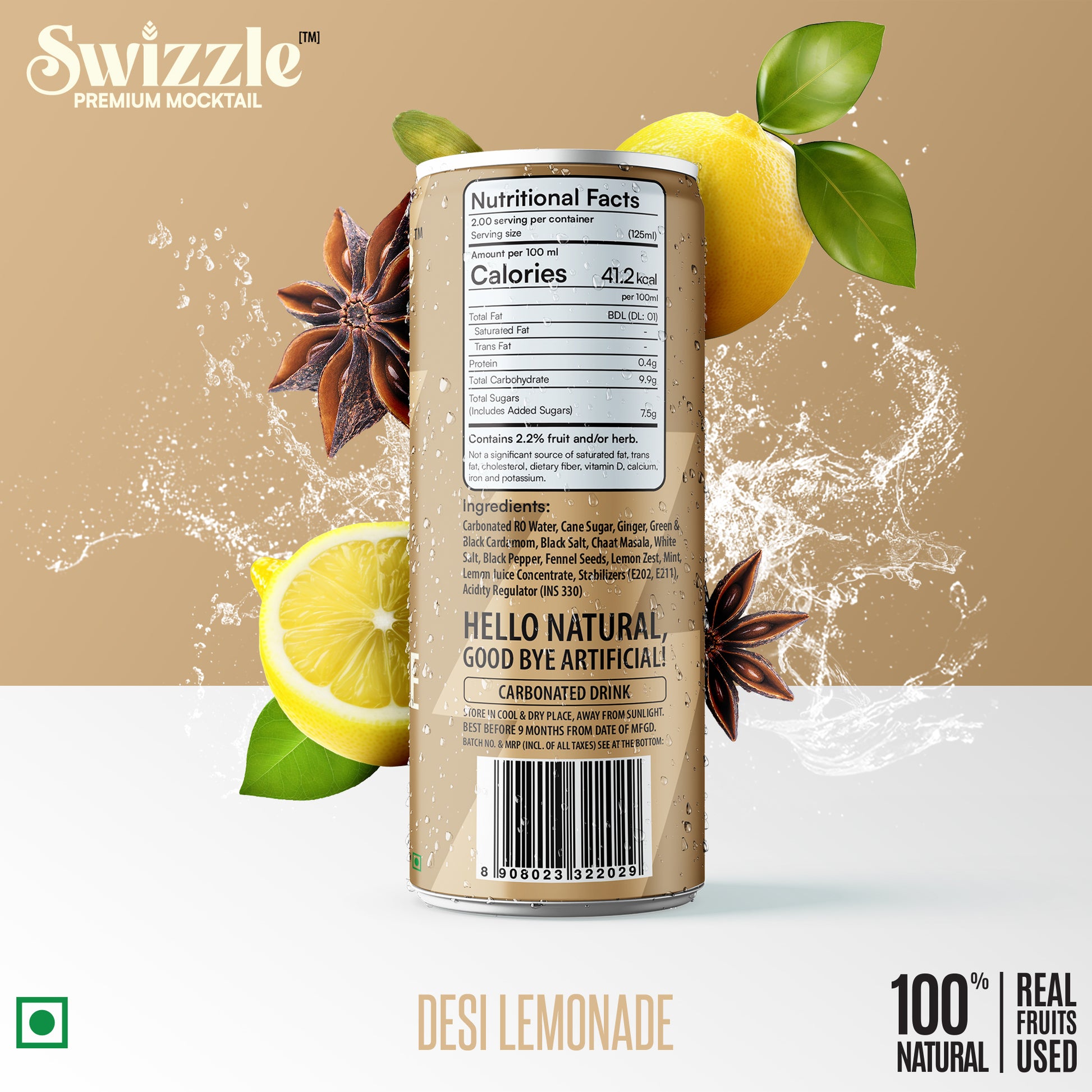 Desi Lemonade / Shikanji: Carbonated RO Water, Cane Sugar, Ginger, Green & Black Cardamom, Black Salt, Chaat Masala, White Salt, Black Pepper, Fennel Seeds, Lemon Zest, Mint, Lemon Juice Concentrate, Stabilizers, Acidity Regulator.